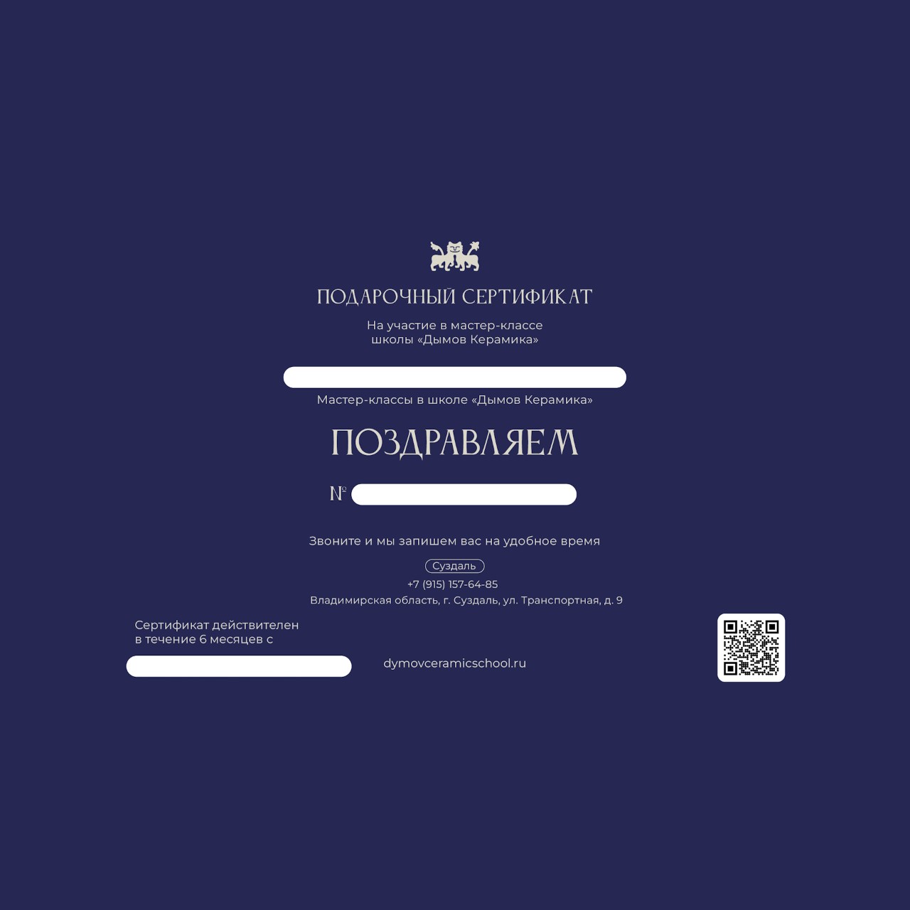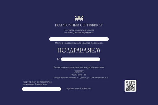 Также подарочные сертификаты можно приобрести в магазине «Дымов Керамика» (Суздаль, Транспортная улица, 9)